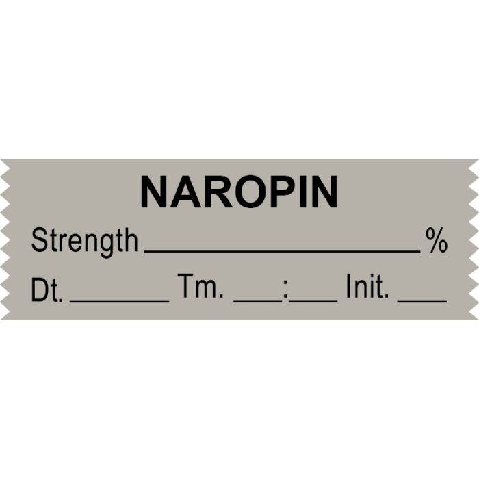 This anesthesia drug syringe tape is printed for Naropin % DTI and uses removable adhesive on flexible paper tape to support temporary yet secure labeling. Conforming to ASTM D-4774-93 color-coding standards with gray coloration, it helps meet Joint Commission NPSG 03.04.01 while improving medication safety and identification. The roll provides 500 inches of 1/2" x 1-1/2" tape wound with labels facing outside for easy dispensing.