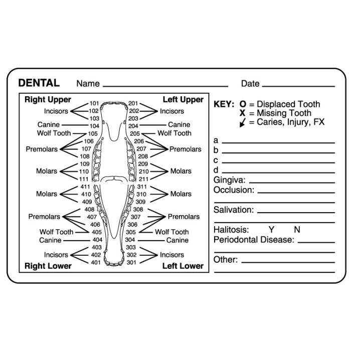 DENTAL Name __ Date __ Right Upper Left Upper 101 201 KEY: O = Displaced Tooth Incisors 102 202 Incisors X = Missing Tooth 103 203 Canine 104 204 Canine = Caries, Injury, FX